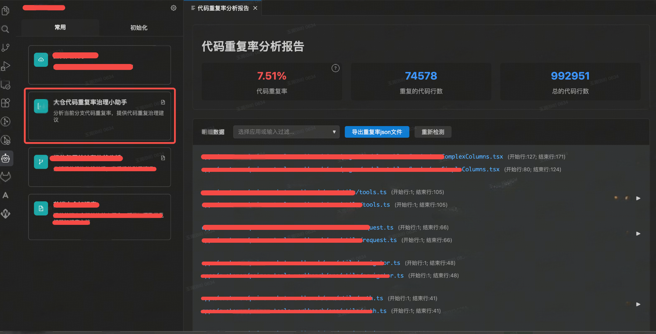 代码重复率是衡量大仓代码可复用的重要指标,也是平台侧一直推进的治理事项,前期代码重复率的统计都依赖于研发本地跑脚本看数据,每个迭代结束才清楚治理效果。为了便于研发在本地能够实时的查看代码质量分的治理结果,提供了VSCode插件来实时统计结果,如下功能所示: