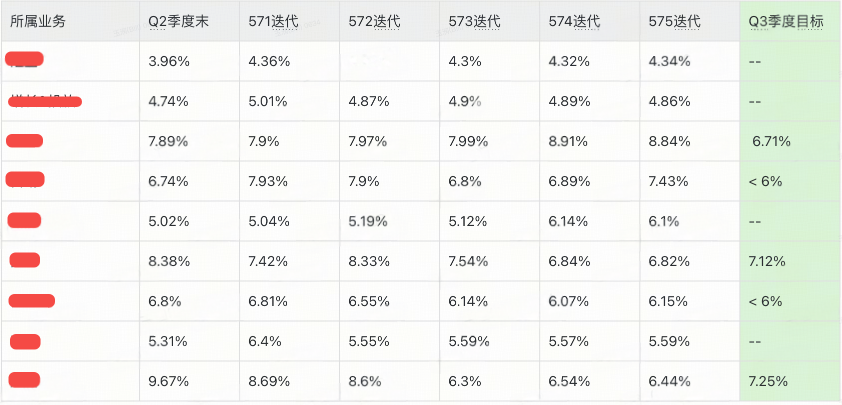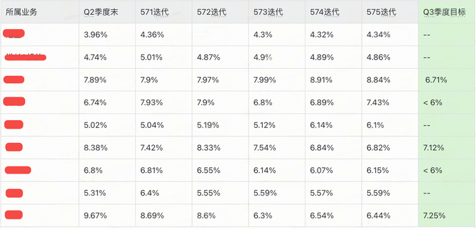研发通过点击上面的治理小助手,就能实时查看当前分支的治理效果,极大的提升了治理效率。同样在每双周也会进行代码重复率的同步,在季度末会进行治理目标的复盘,如下是2025年Q3季度各业务域的代码重复率治理情况: