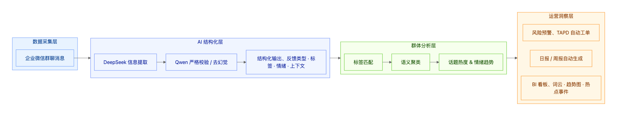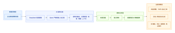 数据采集层 → AI 结构化层 → 群体分析层 → 运营洞察层