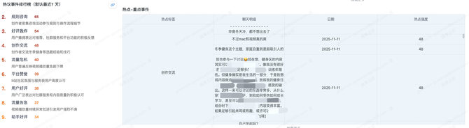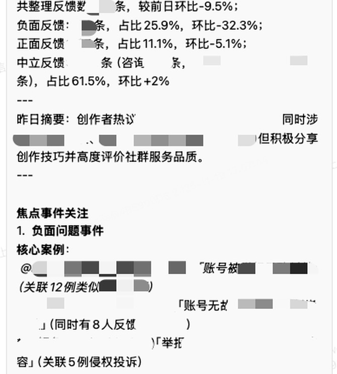 AI 带来的价值不仅体现在规模化处理,更重要的是对关键事件的提前洞察能力。系统能够识别短时间内出现的异常聚集信号,如创作流程、审核体验、版权申诉等领域的情绪波动。当某一话题的负面表达突然增多时,系统会自动聚合并提升为重点关注事件,让团队能在问题形成大范围扩散前就提前介入,在早期苗头阶段就进行响应与处理。