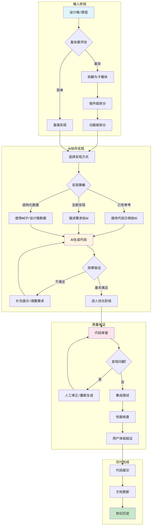 将UI/UX设计稿(如Figma, Sketch等)精准地转化为代码,是前端开发中的一项重要工作。借助AI-IDE,我们可以显著提升这一环节的效率。核心策略是“分治实现,迭代优化”,避免期望AI一次性完成整个复杂页面。推荐的工作流如下: