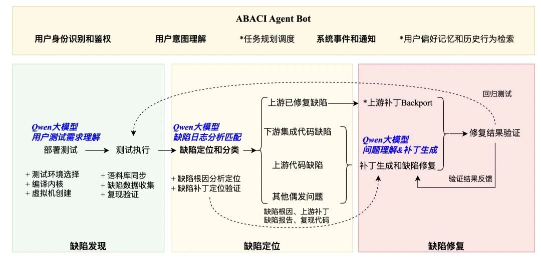 用户意图理解与人机协同:通过钉钉机器人(ABACI Agent Bot)实现与用户协作与主动通知,支持自然语言输入测试目标,用户通过与机器人交互执行测试任务,机器人实时通知测试结果和内核问题;