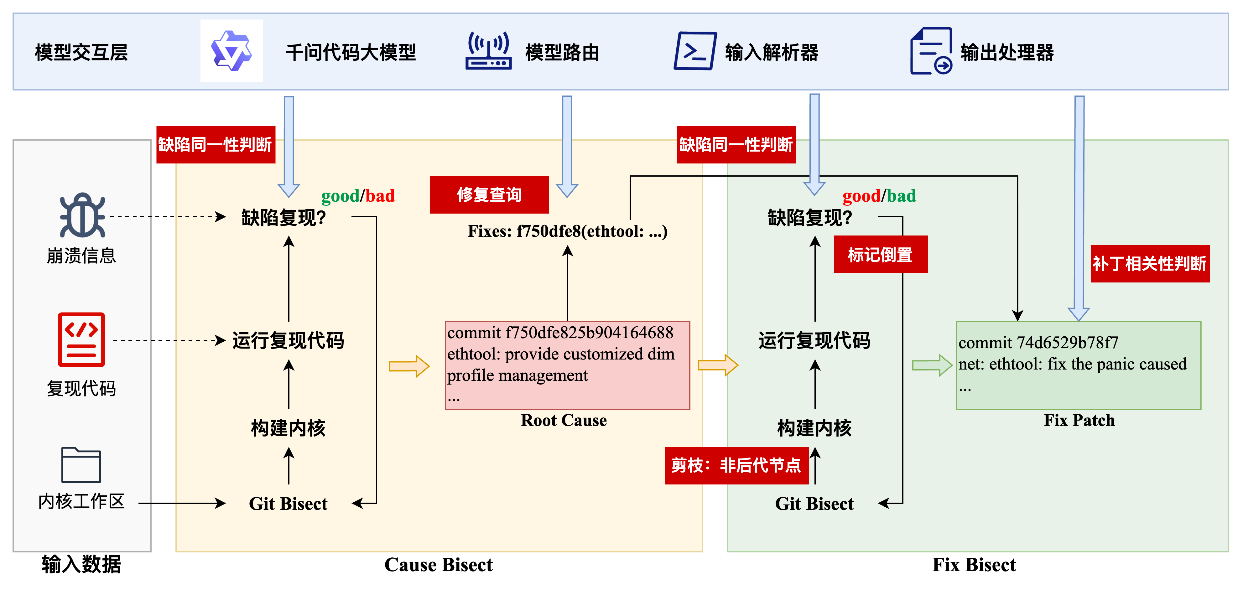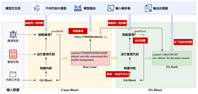 如图所示,整个流程分为两步:首先在当前使用的内核分支中执行 Cause Bisect,识别导致该问题首次出现的引入提交(Root Cause);随后在上游主线仓库中开展 Fix Bisect,查找是否存在已被社区修复但尚未合入的补丁。