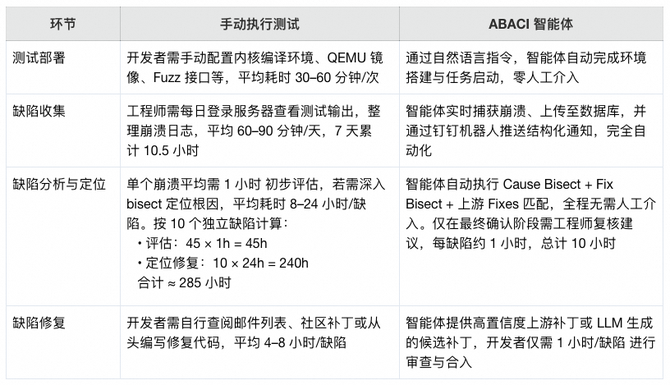 这一结果表明,ABACI 不仅实现了“低介入”,更真正做到了“可持续”——即使在高频迭代的内核开发节奏下,也能以极低成本维持高质量的缺陷发现与修复能力。