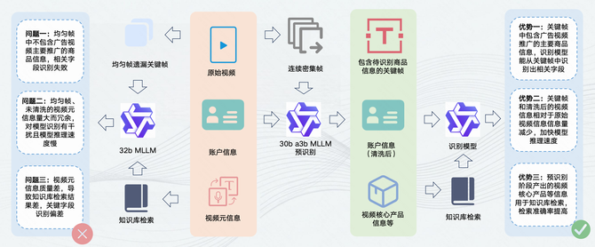 针对这一问题,快手磁力引擎技术团队专门增设了预识别模块,它就像AI的“聚焦镜”,在正式识别前,先用成本较低的小模型快速扫描整个视频,过滤掉无关的噪音信息,并智能地提取出包含核心商品信息的关键帧和内容摘要。这确保了后续的大模型能够集中精力处理最有价值的信息。