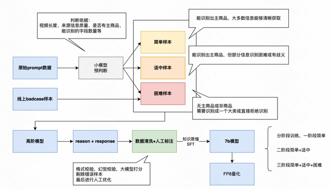 样本分级:用轻量模型对原始数据和线上badcase进行难度评估,分为简单、适中、困难三类。