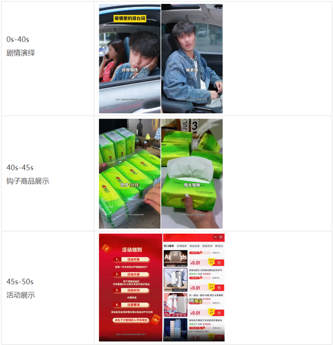 视频核心商品:淘宝新人特惠购活动,主要商品包括心相印抽纸(品牌:心相印,价格:0.01元,特点:柔软亲肤、加大加厚、湿水不破、官方发货、包邮),以及其他日用百货、食品生鲜等商品,价格均为0.01元。活动仅限一年内未在淘宝APP购物的用户参与。可以看到整体内容包含钩子品的关键信息以及相关活动信息,为下游更精准的结构化识别任务过滤了很多非必要信息。
