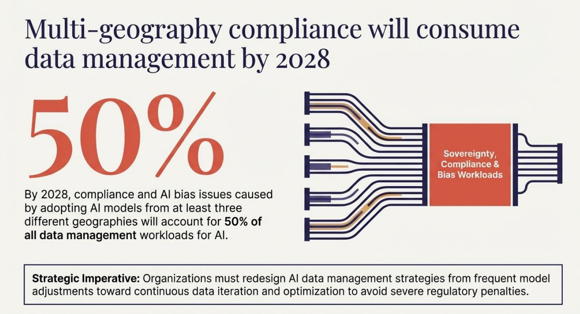 AI的效果高度依赖数据质量,而随着企业同时使用来自中美欧等多地的AI模型,数据主权、合规性及偏见问题日益突出。Gartner预测,到2028年,这些问题将占据AI数据管理工作量的50%。