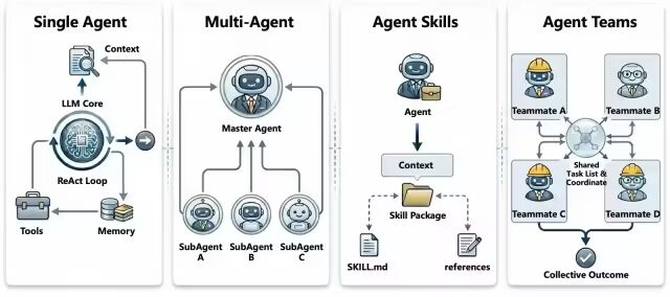 这正是Agent架构演化的逻辑起点,我们不得不在大模型外围构建层层叠叠的结构与工具,通过“工程化”的手段来辅助其完成知识的检索、上下文的组装以及记忆的维护。这也正是当前各类Agent架构百花齐放的最本质的原因。我们不再执着于让模型“记住”所有知识,而是转而设计一套机制,让模型能够“找到”并“理解”所需的知识。基于这一思路,Agent 架构的演化逐渐分化出了四条最主要的路径:“Single Agent → Multi-Agent → Agent Skills → Agent Teams”。