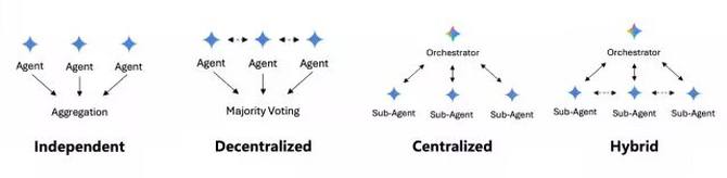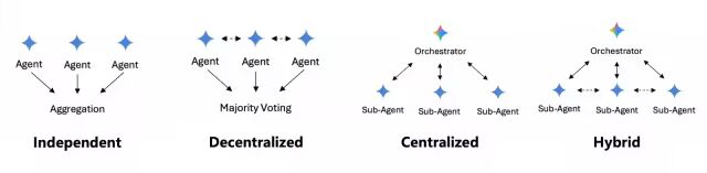 Multi-Agent的模式其实有很多种,在Google的论文里,主要列为四种:独立的(Independent)、去中心化(Decentralized)、中心化的(Centralized)、混合模式(Hybrid)。