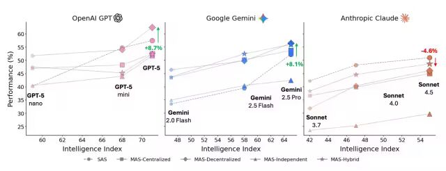 Google为了量化模型能力对Agent性能的影响,在OpenAI GPT、Google Gemini 和 Anthropic Claude上评估了Single Agent和四种Multi-Agent架构。结果可以看到,模型能力与架构之间复杂的关系。通常来说,上了越强大的模型,Agent的效果就越好,Agent的能力与模型能力基本上呈现正相关。