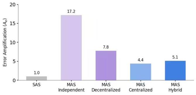 这是最令人警醒的数据:纯粹的独立架构(Independent)可能将错误放大 17.2 倍,而引入中心化机制后,错误放大就可控制在4.4倍。