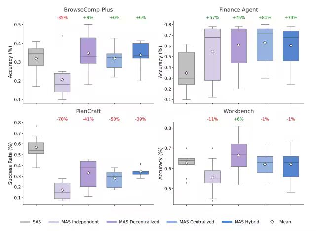 这篇论文通过对比了Single Agent和四种Multi-Agent架构,也就是上文所说的Independent、Decentralized、Centralized以及Hybrid共五种主流架构,得出了若干反直觉却极具指导意义的结论。