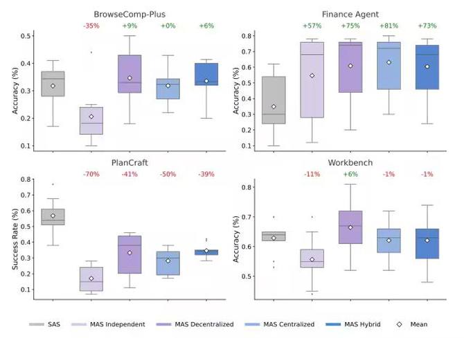 Google在不同任务的Benchmark上跑了多种Agent架构,结论:任务类型决定更优架构。