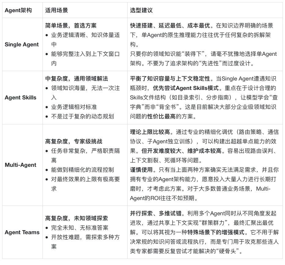结合前文我们对Single Agent、Agent Skills、Multi-Agent及Agent Teams的探讨,我们可以参考这些结论来校准我们的选型策略: