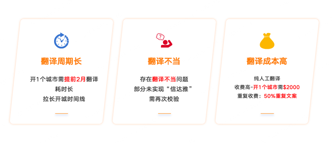 传统上,海外开城的翻译工作是在外部平台找人工翻译。但是每次翻译的时间比较长,且翻译效果也无法保证,还需要local业务人员进行二次核验。同时,由于是人工翻译,还会带来一定的经济成本,这些都是我们想解决的问题。