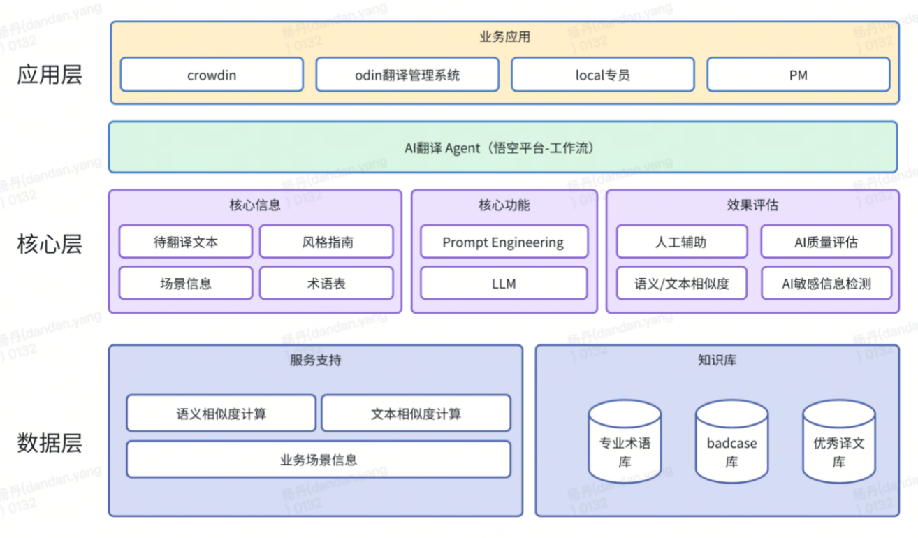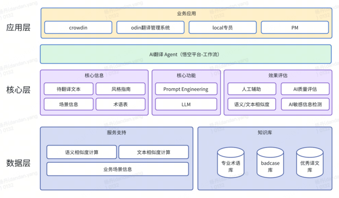 我们开发的这套翻译框架,通过多模块组合来实现从业务使用到后端支持的完整框架。整体上可以分为3层,应用层与业务方、质检方进行交互,中间的核心层依靠悟空平台(货拉拉自研大模型应用平台)桥接后端的各项核心功能,并通过数据层来保存和调用数据。