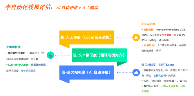 首先是自动化的指标评估。我们引入了COMET/BERTScore等语义相似度与BLEU等文本相似度的双重打分机制,既看翻译结果在字面上与人工打标的差异,也看与原文在语义空间中的距离,加权综合评估翻译效果。
