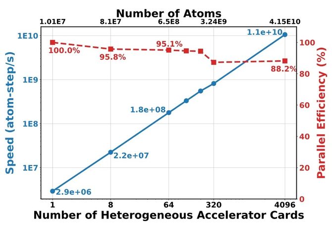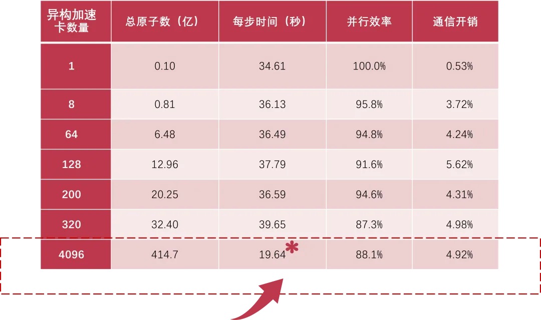 本次模拟的另一个重要信号是:在4096卡上实现414.7亿原子模拟的同时,单卡性能同样惊人。据透露,单张加速卡即可模拟千万级原子体系,一台8卡服务器则可达到上亿原子规模。