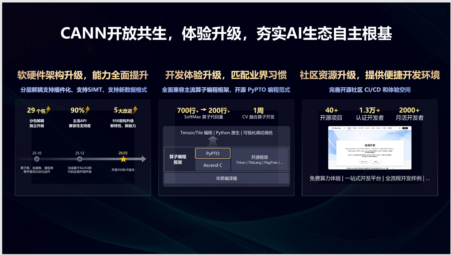身份转变的背后,是昇腾战略重心的迁移。过去半年多,昇腾其实只聚焦于两件事:升级开发体验,繁荣开源社区。而这所有动作的底座,都指向了那个曾被视作“黑盒”的核心软件——CANN。