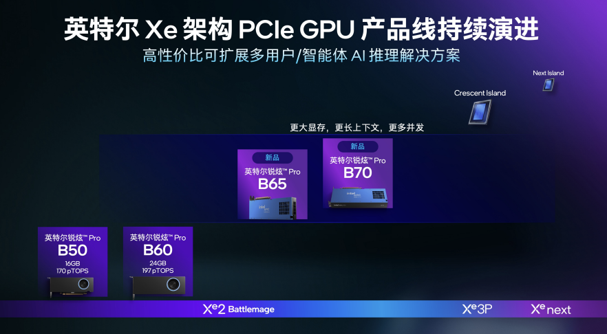 说到显卡,这次发布的锐炫Pro B70无疑是现场工程师与创作者们瞩目的绝对焦点。作为基于第二代Xe2架构的旗舰级专业GPU,B70配备了惊人的32GB超大显存,AI算力峰值高达367TOPS。