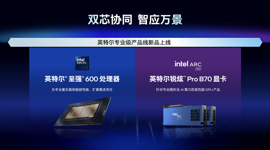 本次的主题是“双芯协同,智应万景”,不难理解英特尔在做一道怎样的加法算术。通过至强600与锐炫Pro B70在算力、显存、扩展性与生态上的叠加,它意图为千行百业提供一个能够从容应对未来混合AI挑战的“全能底座”。